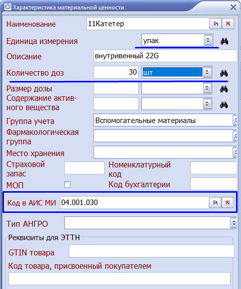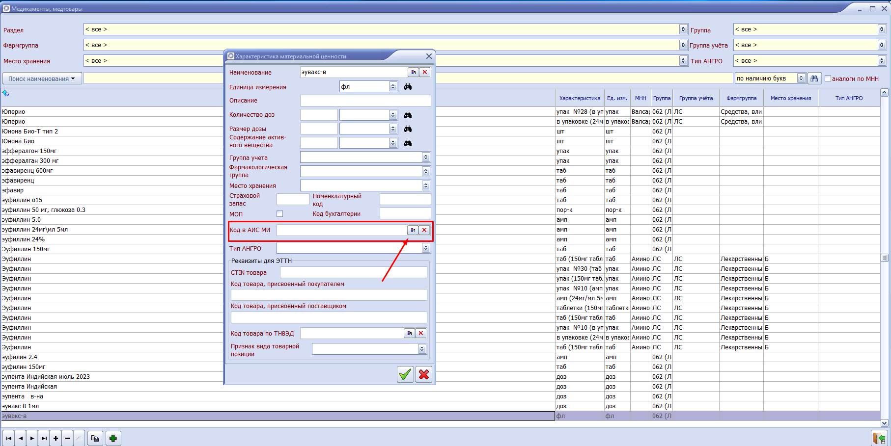 Находимся в задаче «Медикаменты, медтовары» заходим Медикаменты - Материальные ценности - Медикаменты, медтовары, открываем «Характеристика материальной ценности». Видим новое поле «Код в АИС МИ». Нажимаем на кнопку "выбор из списка" по данному полю: