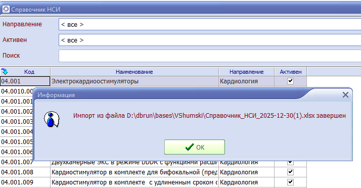 В появившемся окне выбираем путь к эксель файлу «Справочник_НСИ_2025-12-30.xlsx». Когда импорт завершится появится окно с информацией о законченном импорте и справочник будет заполнен.