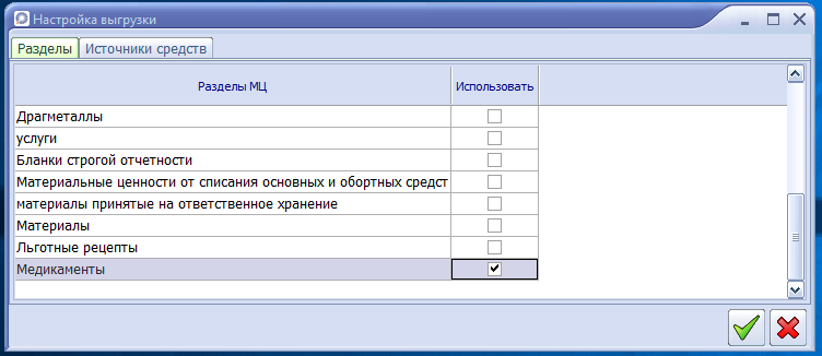 В появившемся окне во вкладке «Разделы» мы отмечаем разделы, которые будут участвовать в выборке данных: