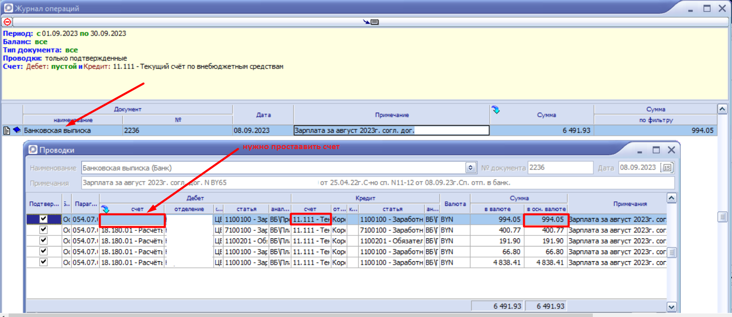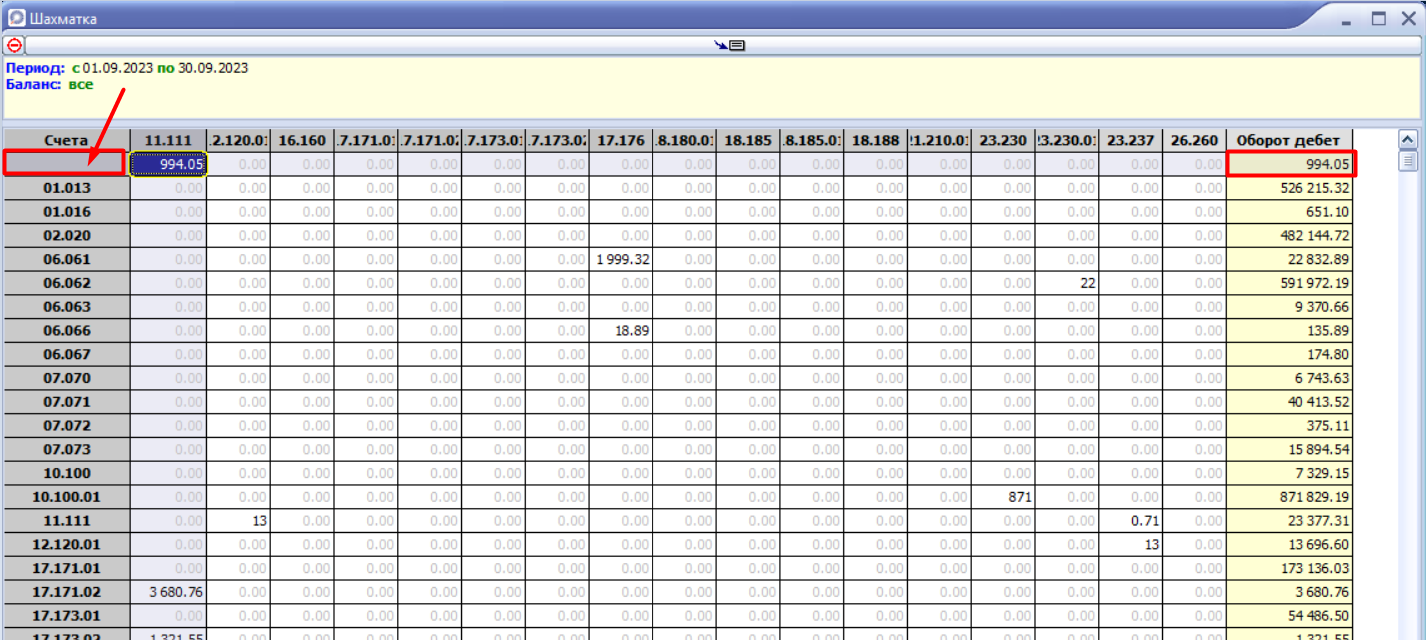 Видим, что есть сумма по 111 счету и пустая ячейка в колонке "Счета". Это значит что внесена односторонняя проводка.