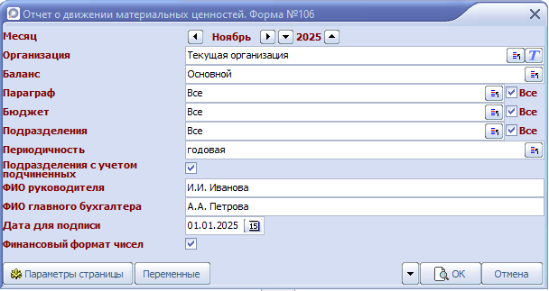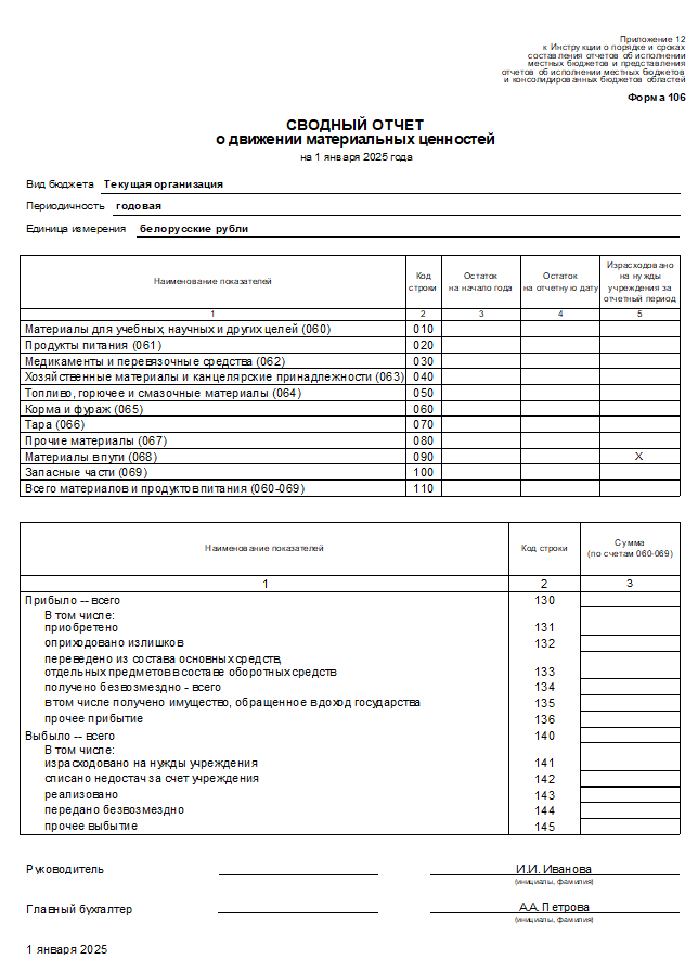 В задаче "Главная книга" был добавлен сводный отчет для сельсоветов "Отчет о движении материальных ценностей. Форма №106".