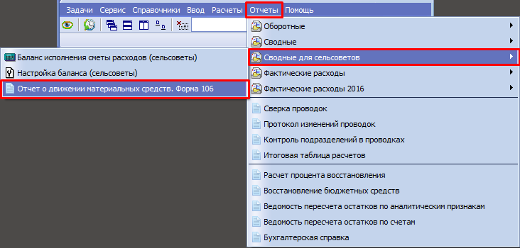 Для формирования отчета заходим в Отчеты - Сводные для сельсоветов - Отчет о движении материальных средств. Форма 106.