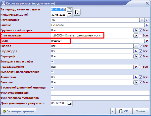 Заходим Отчеты - Кассовые расходы - Кассовые по документам. Выбираем параметры за тот же период, по тому же плану и по статье 1100500.