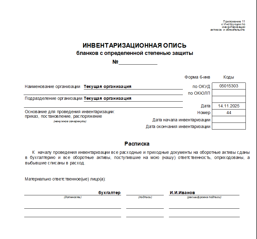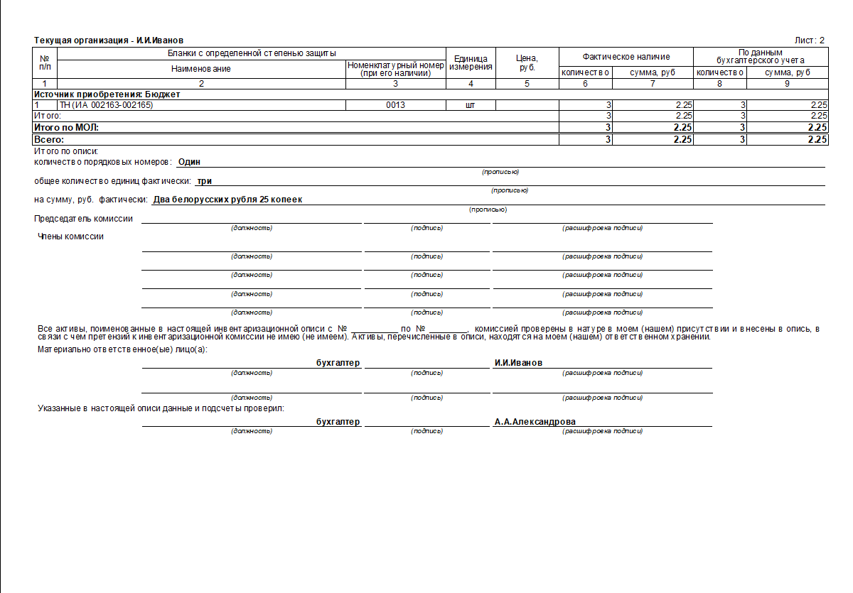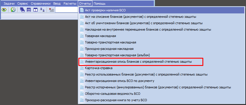 В задаче "Бланки строгой отчетности" был добавлен отчет "Инвентаризационная опись бланков с определенной степенью защиты". Форма отчета аналогична той, что используется в материальной группе.