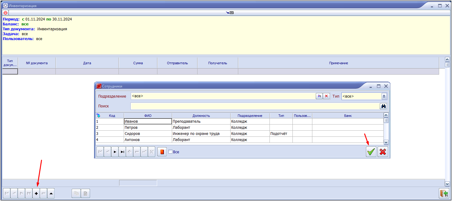 В "Комплекс МАП" заходим в Ввод\Инвентаризация. С помощью кнопки "+" добавляем документ. Появляется окно с выбором МОЛ. Чтобы выбрать нескольких МОЛ, можно выделить с помощью кнопки "слэш" ( / ), в случае если нужно отметить всех МОЛов, нужно нажать "+" на цифровой дополнительной клавиатуре и на экране все строки с МОЛами выделятся синим цветом. После подтверждаем, нажав на "зеленую галку".