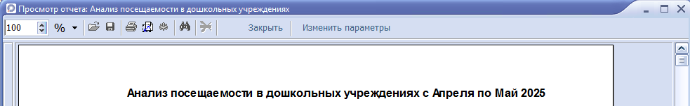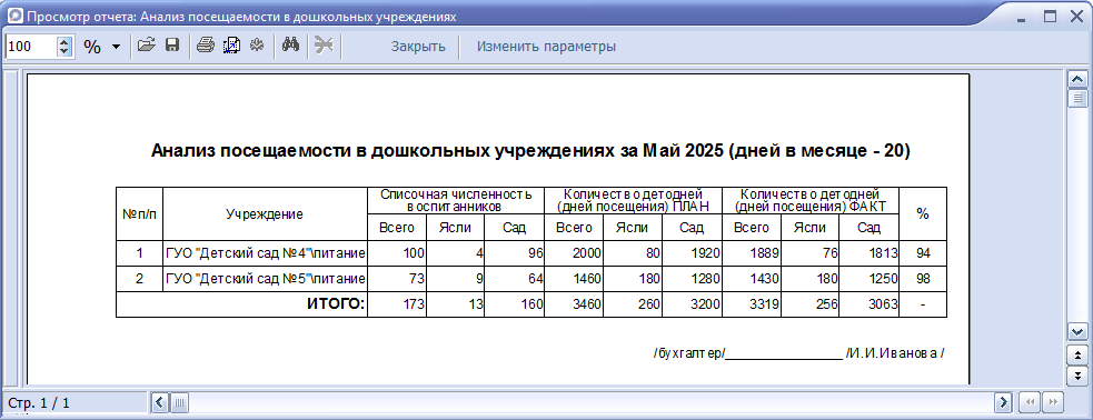 Отчет показывает плановую и фактическую посещаемость в дошкольных учреждениях за отчетный период.