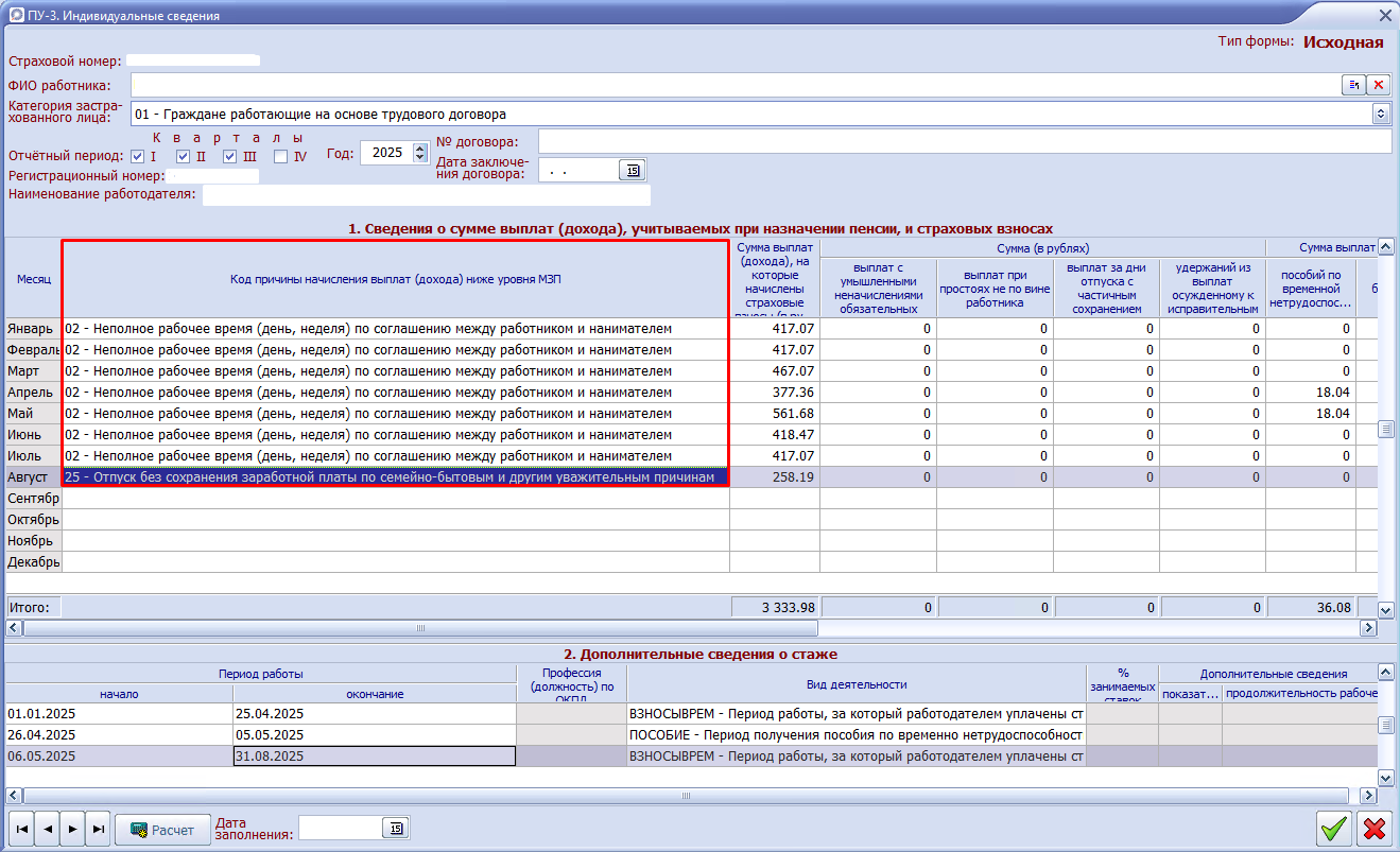 Согласно постановлению правления ФСЗН от 29.02.2024 N 2 в задаче Персонифицированный учёт ФСЗН для формирования ПУ-3 в справочнике "Причины начисления выплат (дохода) ниже уровня МЗП" сделаны следующие изменения: