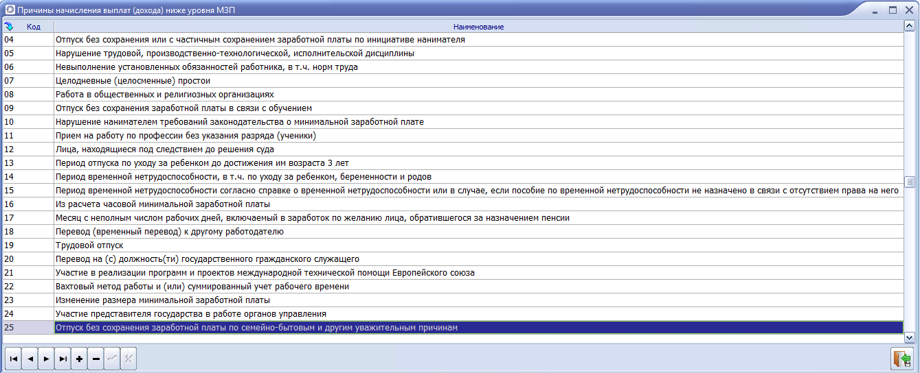 - добавлен код 25 Отпуск без сохранения заработной платы по семейно-бытовым и другим уважительным причинам.