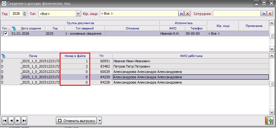 Добавлена графа "Номер в файле" при формировании сведений о доходах физических лиц. Заполняется автоматически после выгрузки пачки.