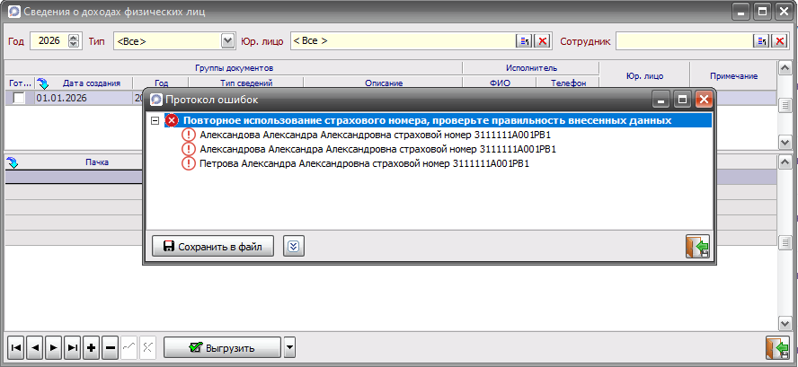 Теперь при выгрузке сведений о доходах физических лиц, если в пачке присутствуют работники с одинаковым страховым номером, программа выведет уведомление ошибки.
