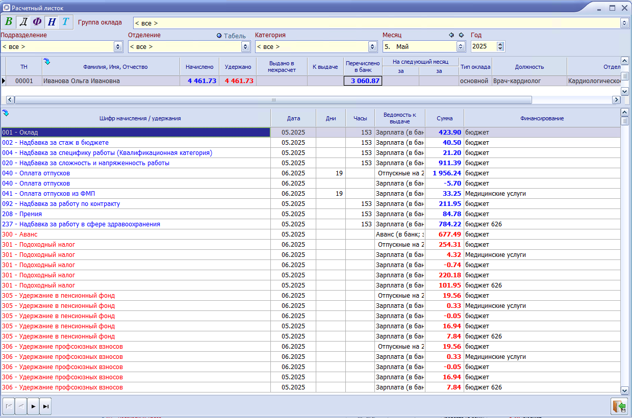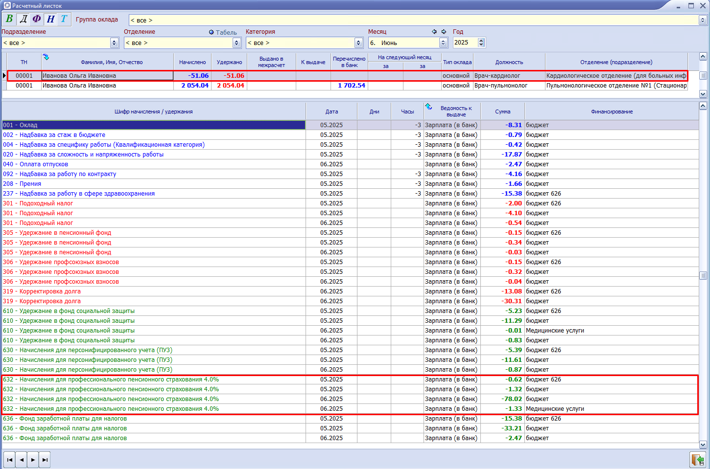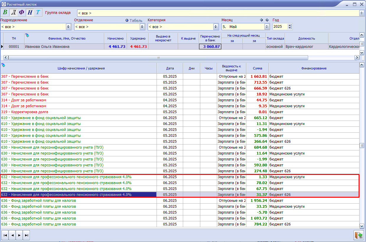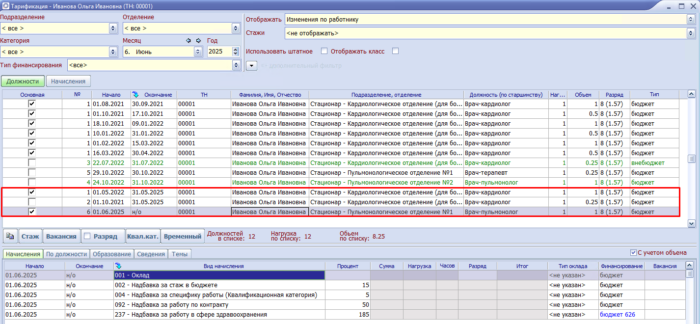 Пример: Работник Иванова О.И. занимала должность врач-кардиолога до 31.05.2025, на данную должность начисляются взносы на ППС.