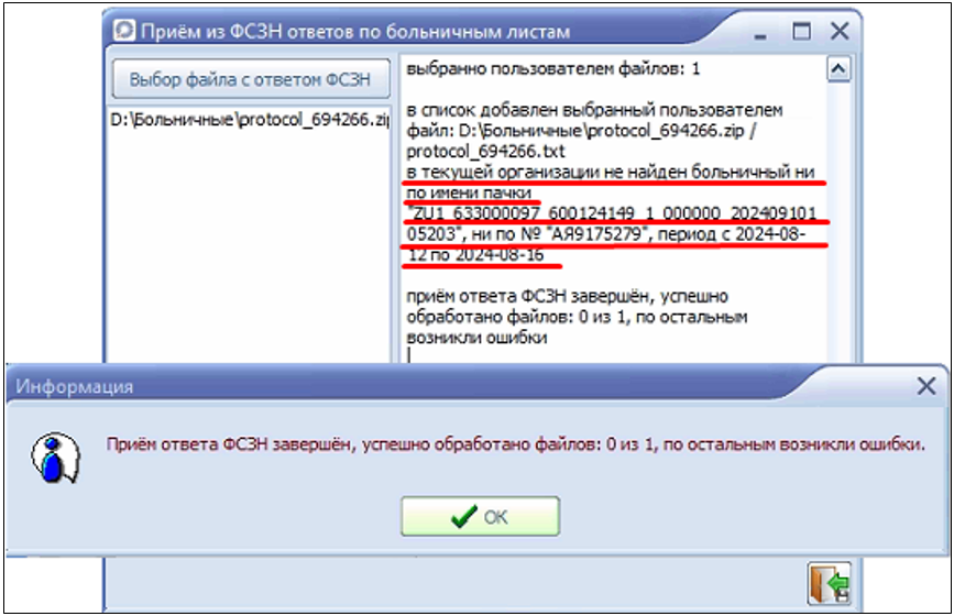 1. Больничный был внесен, по нему был сделан запрос в ФСЗН, потом удален и опять внесен. И в этот новый больничный вгружается протокол из ФСЗНа.
