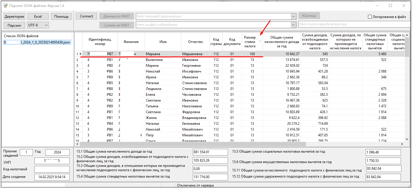 Чтобы найти человека, у которого указана ставка по подоходному 100%, открываем json-файл в программе IncomeJSON. Ставим сортировку по колонке "Размер ставки налога", чтобы стрелка сортировки была направлена вниз.