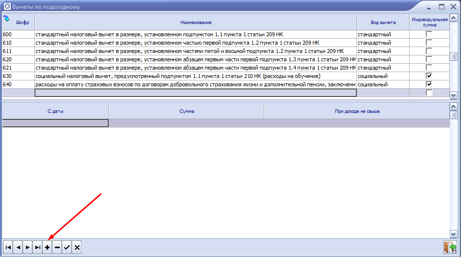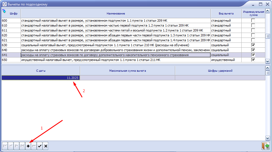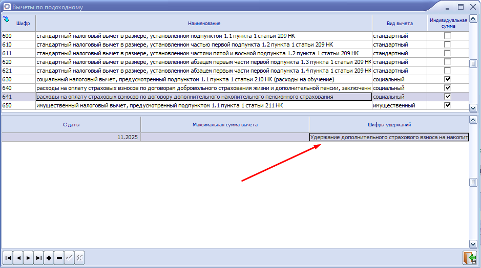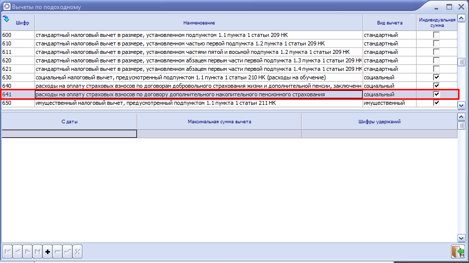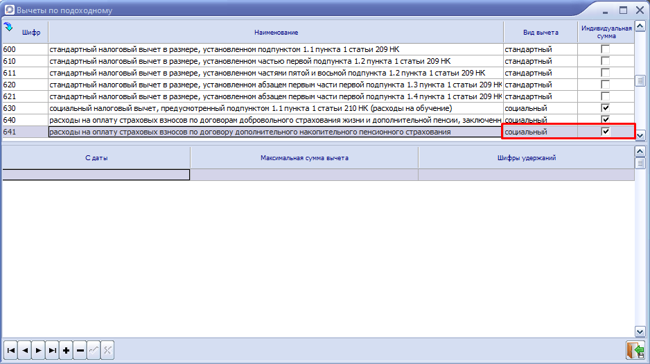 2. Находим шифр 641 (социальный налоговый вычет, предусмотренный подпунктом 1.3 пункта 1 статьи 210 НК). Проверяем, чтобы стояла отметка "Индивидуальная сумма". Если отметки нет, то устанавливаем.