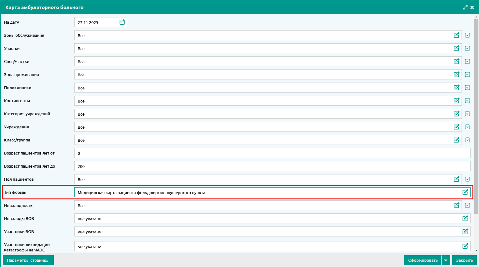 Для формирования нужно перейти в отчет "Карта амбулаторного больного" и выбрать тип формы "Медицинская карта пациента фельдшерско-акушерского пункта".