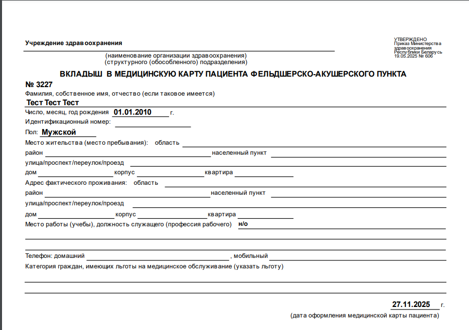 Карта амбулаторного больного с типом формы "Медицинская карта пациента фельдшерско-акушерского пункта" выглядит следующим образом: