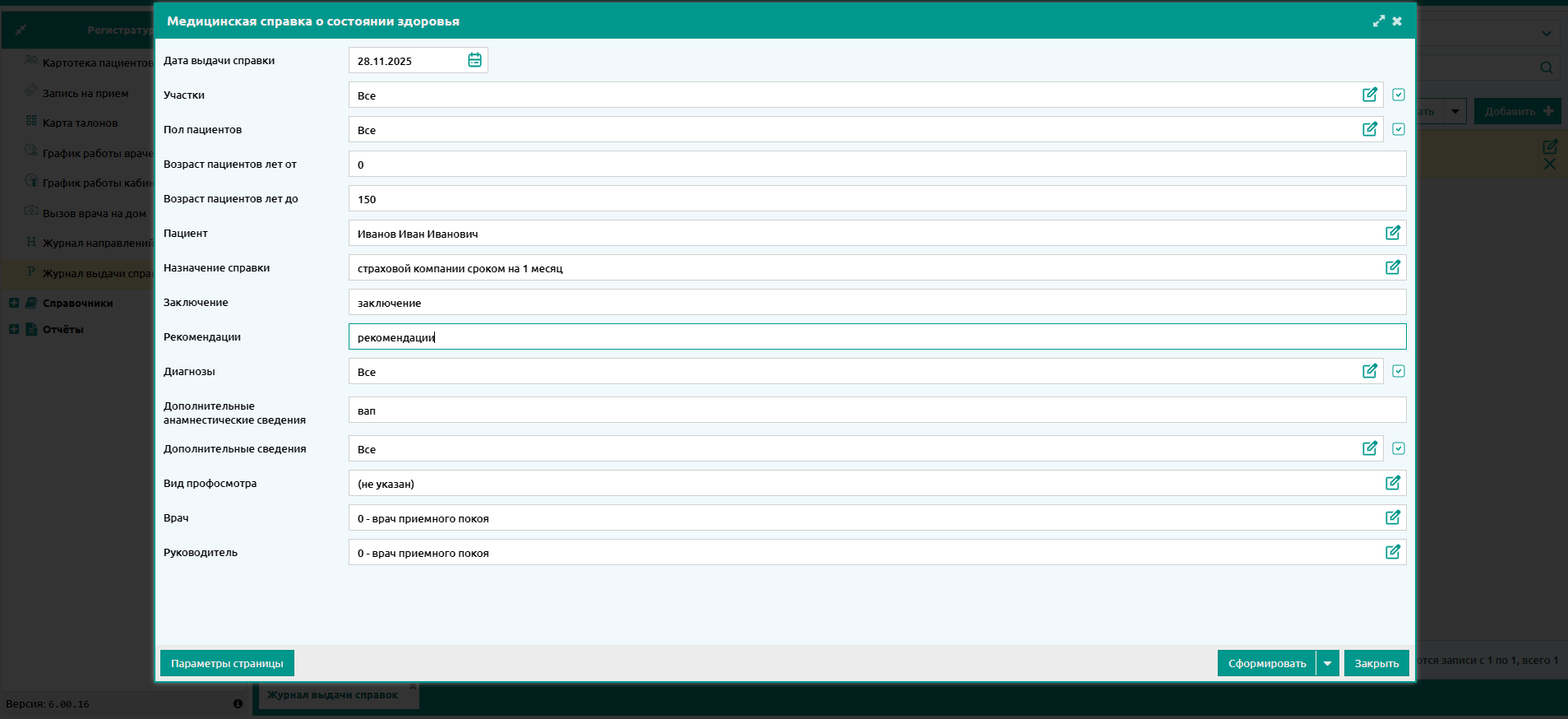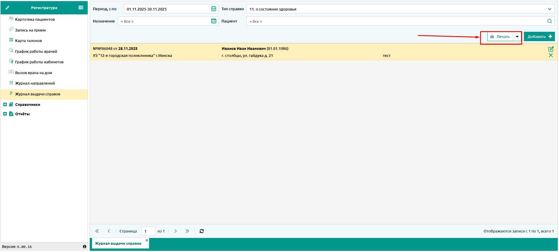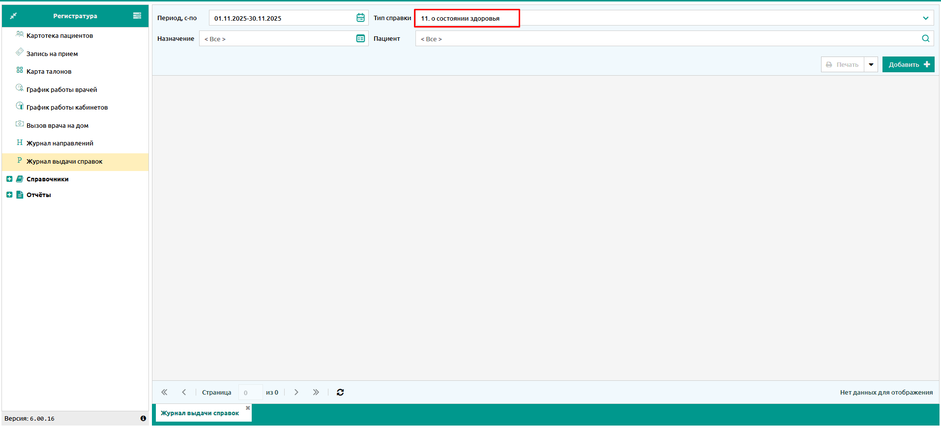 Добавлен новый тип справки "11. о состоянии здоровья" в Журнале выдачи справок.