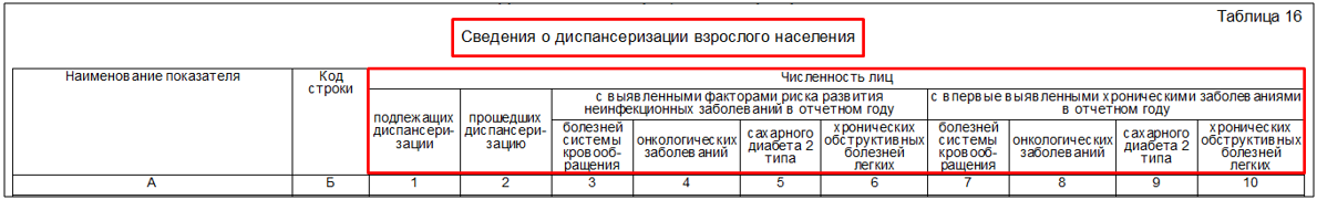 4. хронические обструктивные болезни легких. Данные диагнозы будут попадать в соответствующие графы отчета (графы 7, 8, 9, 10).