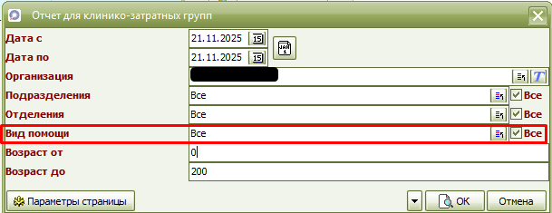 "Отчет для клинико-затратных групп" доработан в соответствии с постановлением №128. В настройке параметров для формирования отчета добавлена строка "Вид помощи".