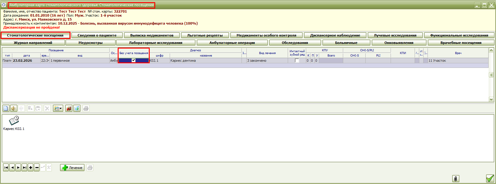 В формах «Стоматологические карты» и «Ортопедические карты» добавлена новая графа «Без учета посещения» на вкладках «Стоматологические посещения» и «Ортопедические посещения».