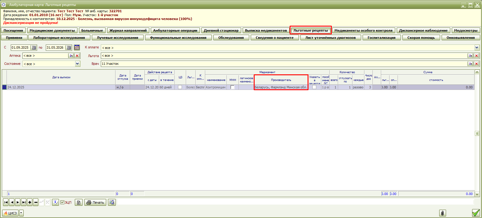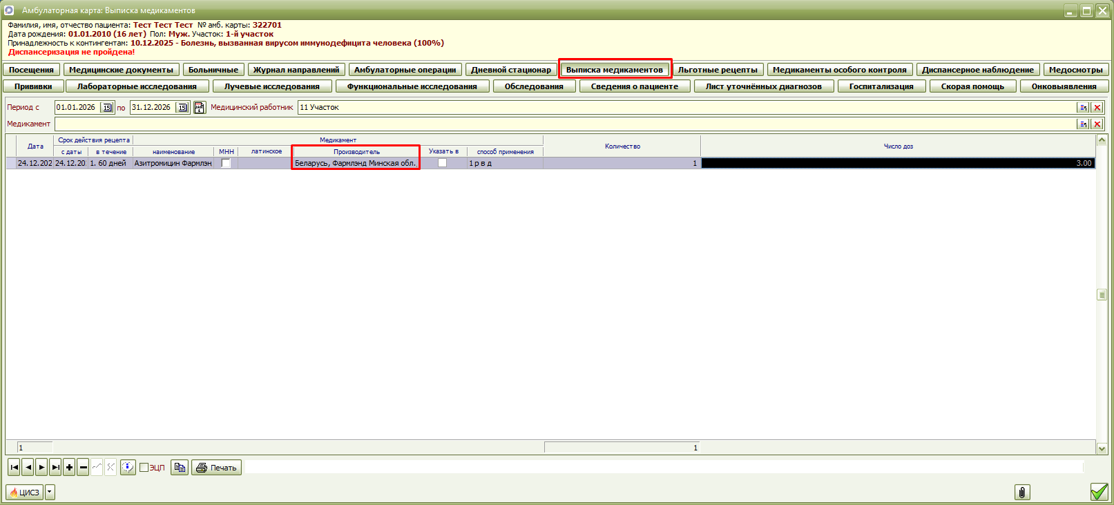 Добавлена новая графа «Производитель» во вкладки «Льготные рецепты» и «Выписка медикаментов» формы «Амбулаторная карта».
