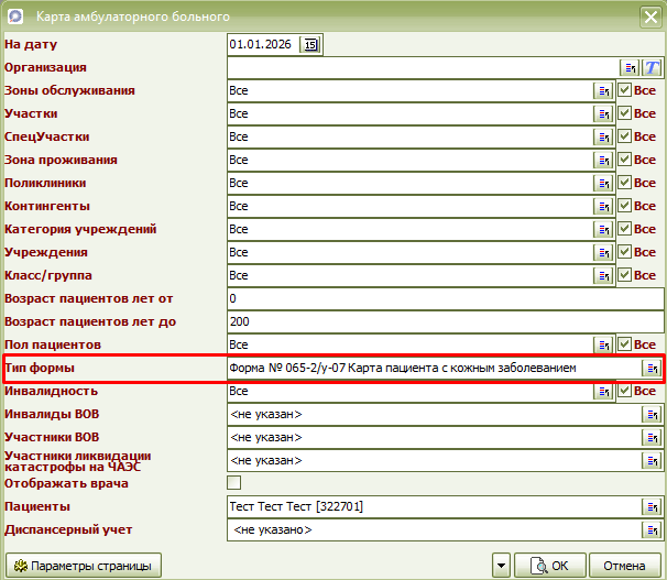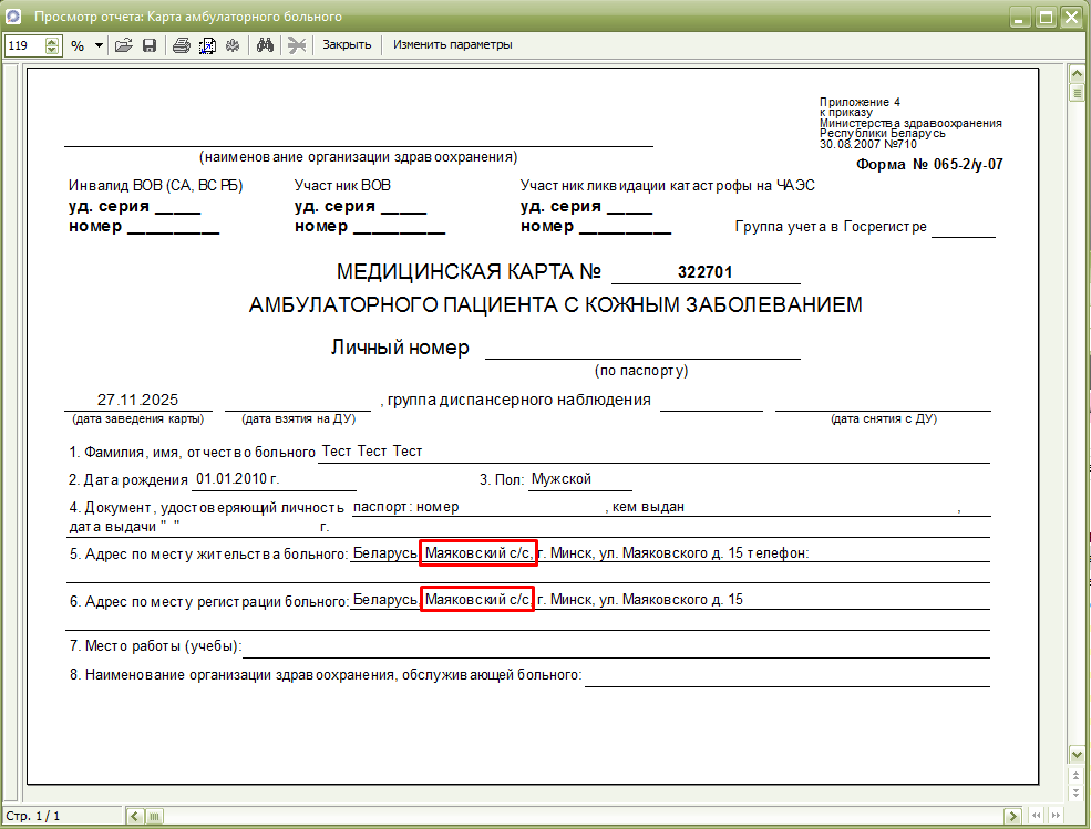В отчете «Карта амбулаторного больного» доработано отображение сельсовета в форме «Форма №065-2/у-07 Карта пациента с кожным заболеванием».