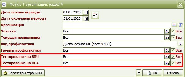 Убраны неактуальные параметры отчета и добавлены параметры «Тестирование на ВПЧ» и «Тестирование на ПСА» для указания соответствующих диагностических исследований.