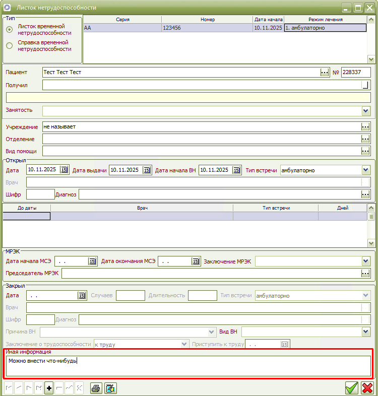 Поле служит для ввода дополнительной информации в листке нетрудоспособности, имеет вместимость 250 символов и выглядит следующим образом: