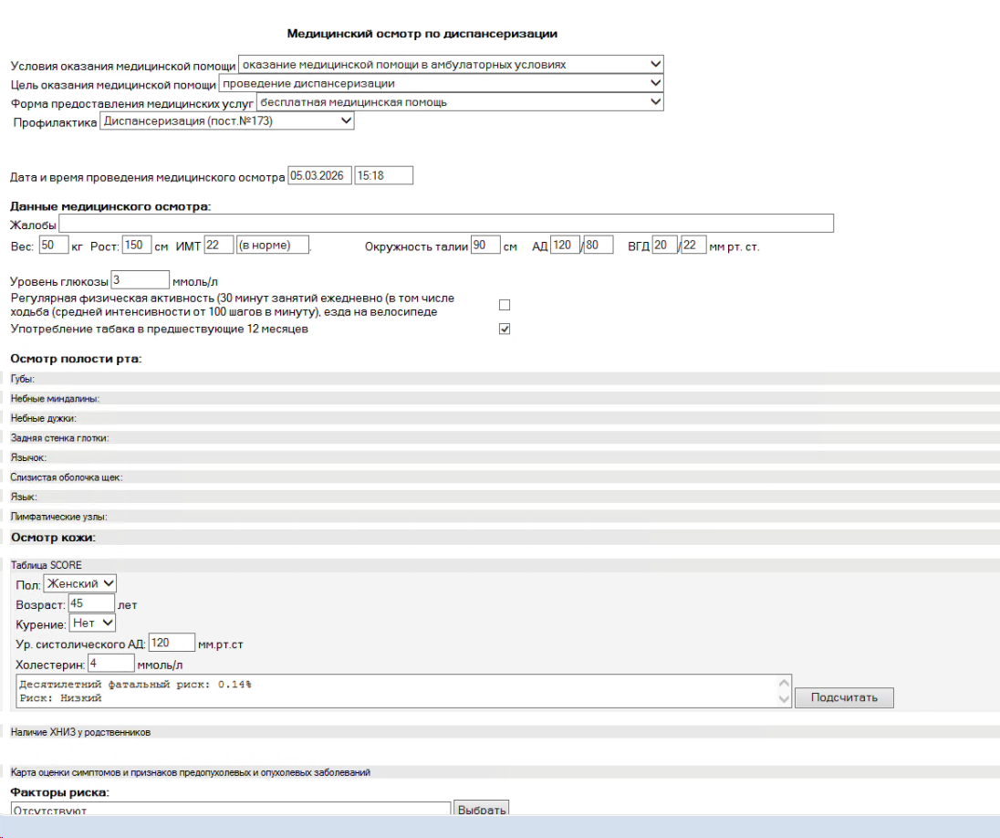 3. После прохождения пациентом врачей и исследований, в редакторе медосмотра получаем информацию по кнопке "Автозаполнение сведений о врачебных приемах и исследованиях (F5)".