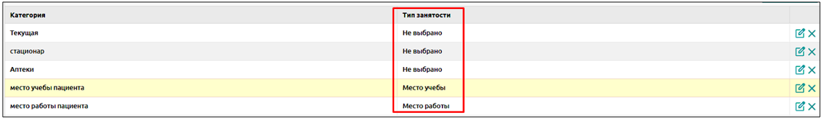 Если для пациента указана в занятости организация с категорией с признаком “место работы”, она будет относится к местам работы, если с признаком “место обучения” – к местам обучения.
