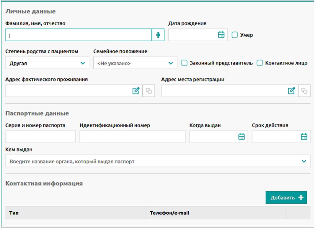 Для родственника указывается личная, контактная информация и паспортные данные.