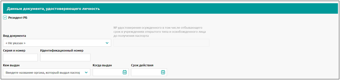 - данные документа, удостоверяющего личность (обязательное заполнение) - вид документа, удостоверяющего личность, серия и номер, кем и когда выдан, срок действия