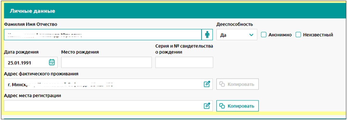 Дееспособность – по умолчанию “да”, “нет” указывается для недееспособных пациентов