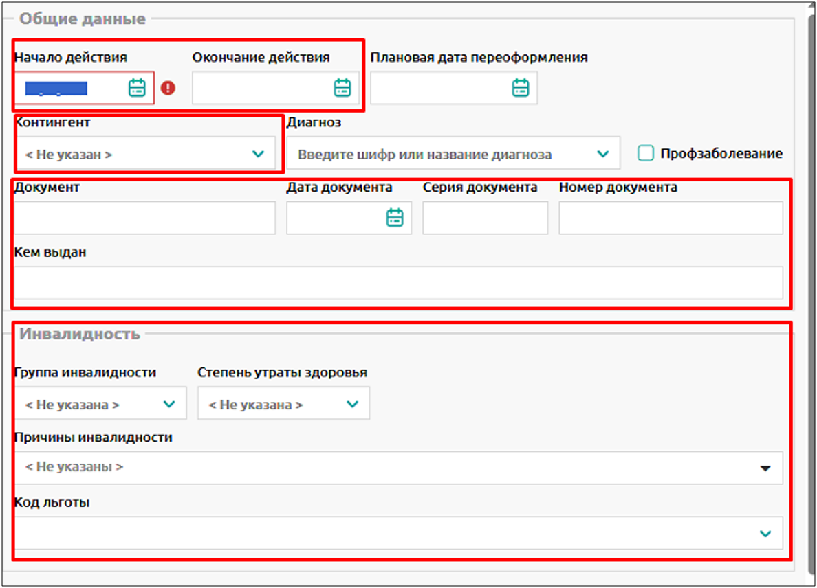 Должна быть заполнена информация об инвалидности в блоке Инвалидность и о документе, подтверждающем инвалидность (наименование документа, серия и номер, дата начала и дата окончания действия (при наличии).