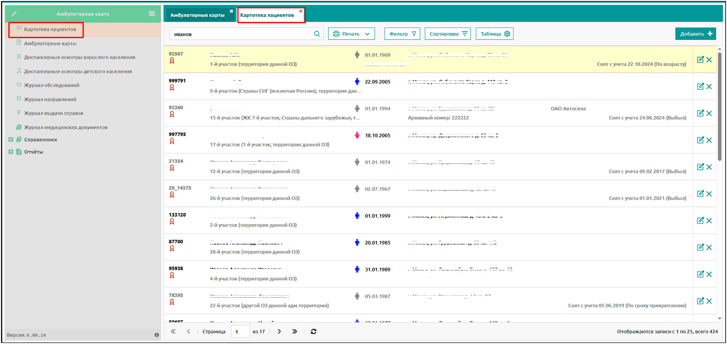 1. Информация о пациенте в карточке пациента (картотека пациентов).
