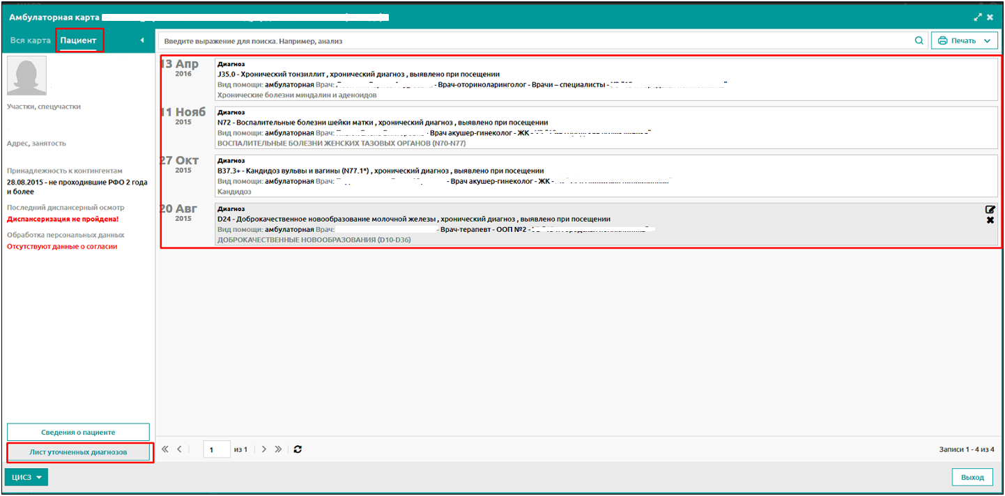 Список уточненных диагнозов отображается на листе уточненных диагнозов амбулаторной карты.