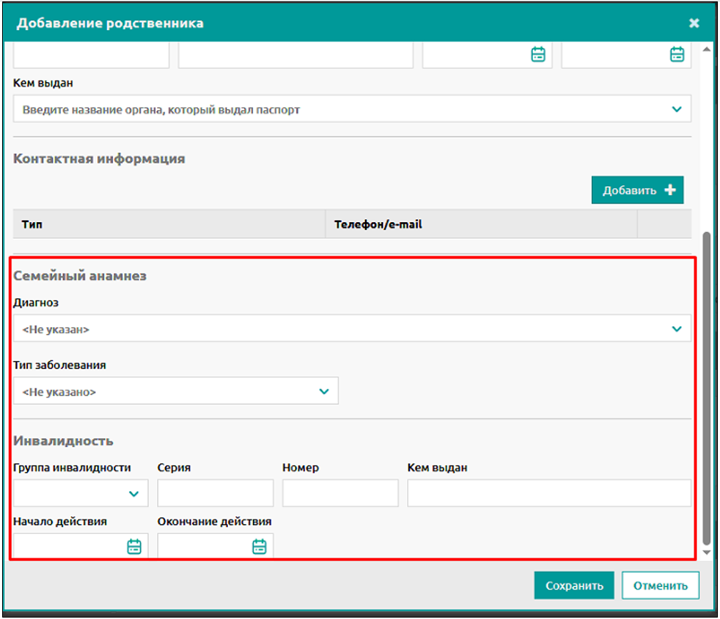 Заполняется информация о семейном анамнезе – наличие у родственника наследственного заболевания. А также, при наличии, информация об инвалидности родственника.