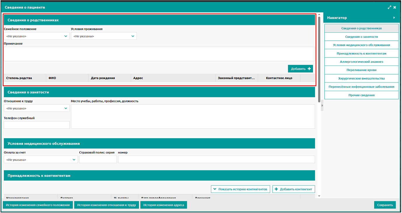 При необходимости, указываются признаки – родственник является законным представителем или контактным лицом пациента.