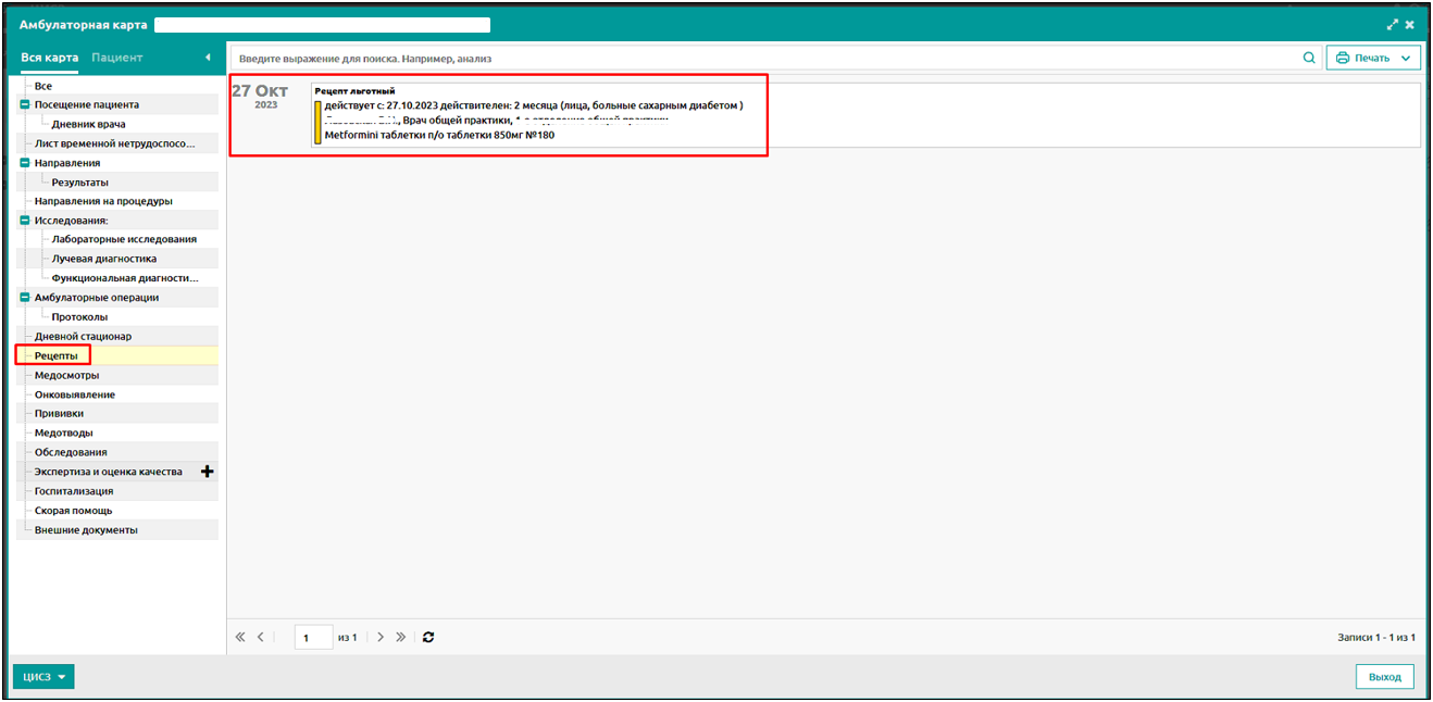 Список выписанных рецептов отображается на вкладке Рецепты амбулаторной карты.