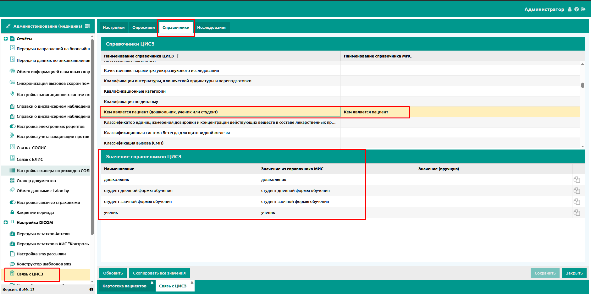В первой колонке первой таблицы нужно в списке найти справочник “Кем является пациент (дошкольник, ученик или студент)” (можно отсортировать список по наименованию).