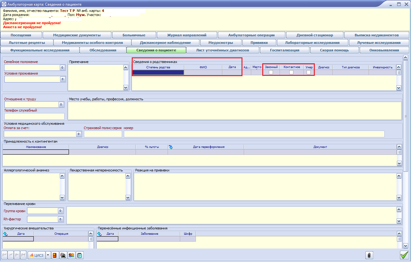 • при необходимости, указываются признаки – родственник является законным представителем или контактным лицом пациента