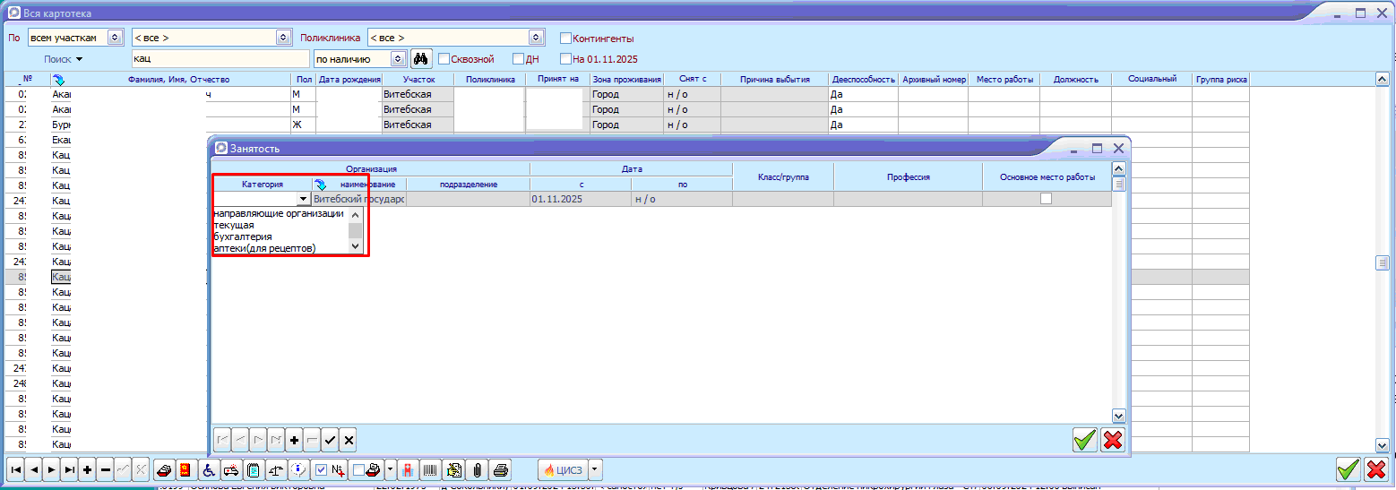 В занятости указываются места работы и места обучения пациента.