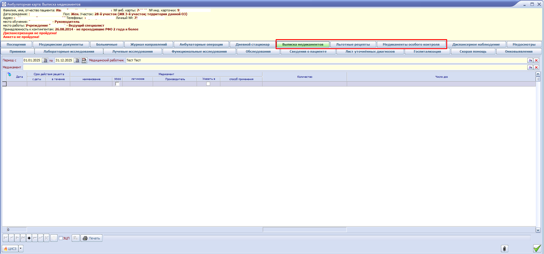 Список выписанных рецептов отображается на вкладках Выписка медикаментов, Льготные рецепты и Медикаменты особого контроля амбулаторной карты.
