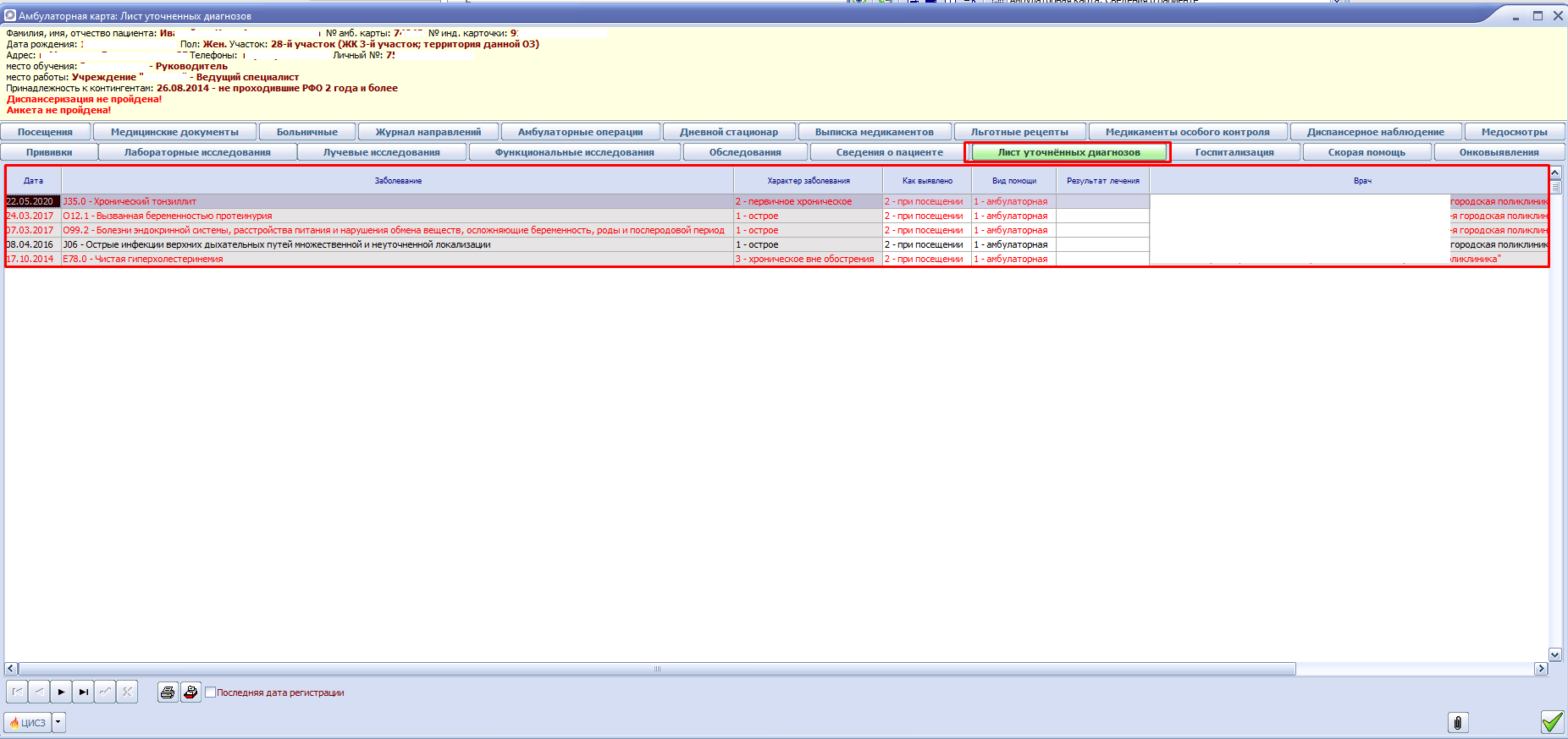 Список уточненных диагнозов отображается на листе уточненных диагнозов амбулаторной карты.