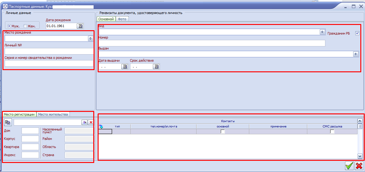 - данные документа, удостоверяющего личность (обязательное заполнение) - вид документа, удостоверяющего личность, серия и номер, кем и когда выдан, срок действия