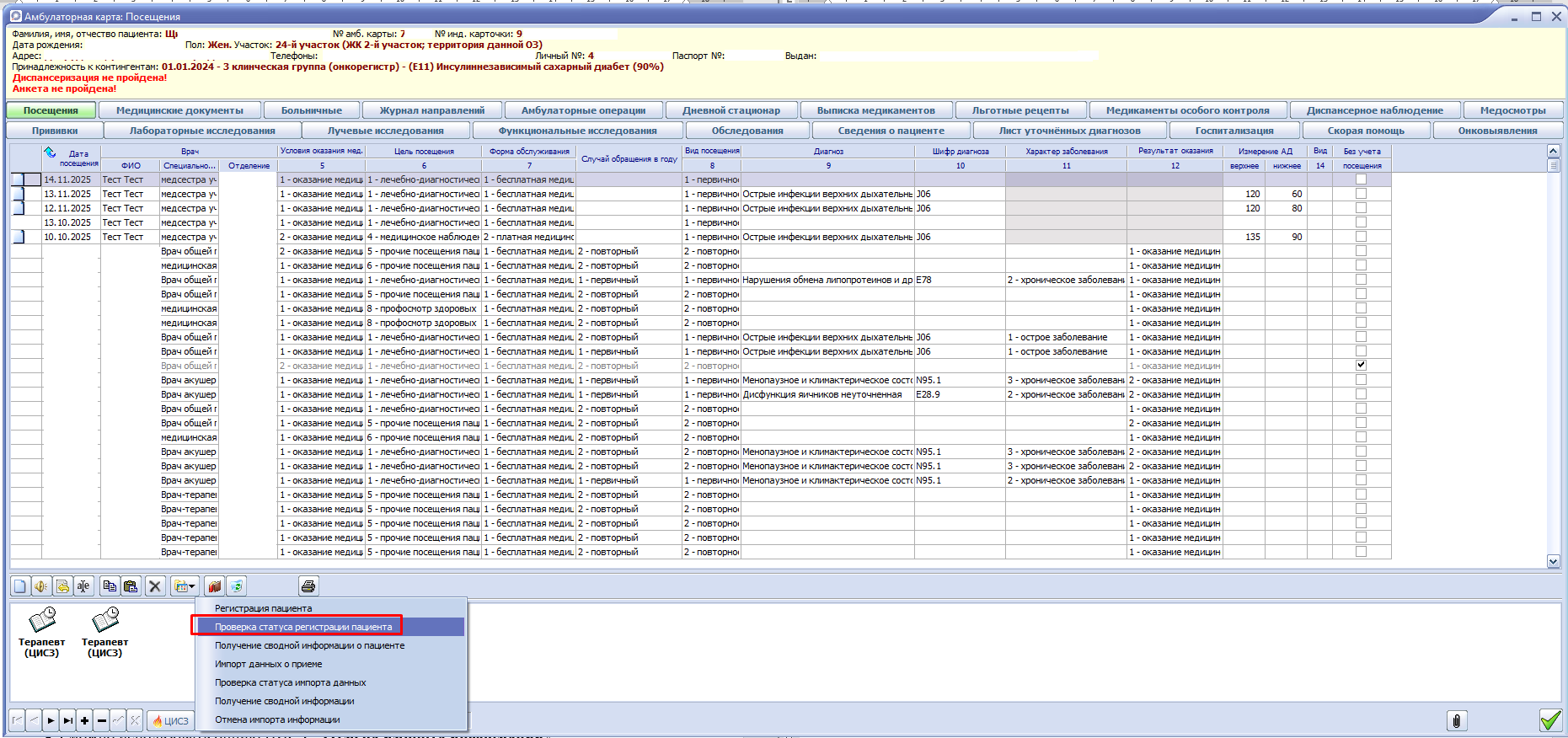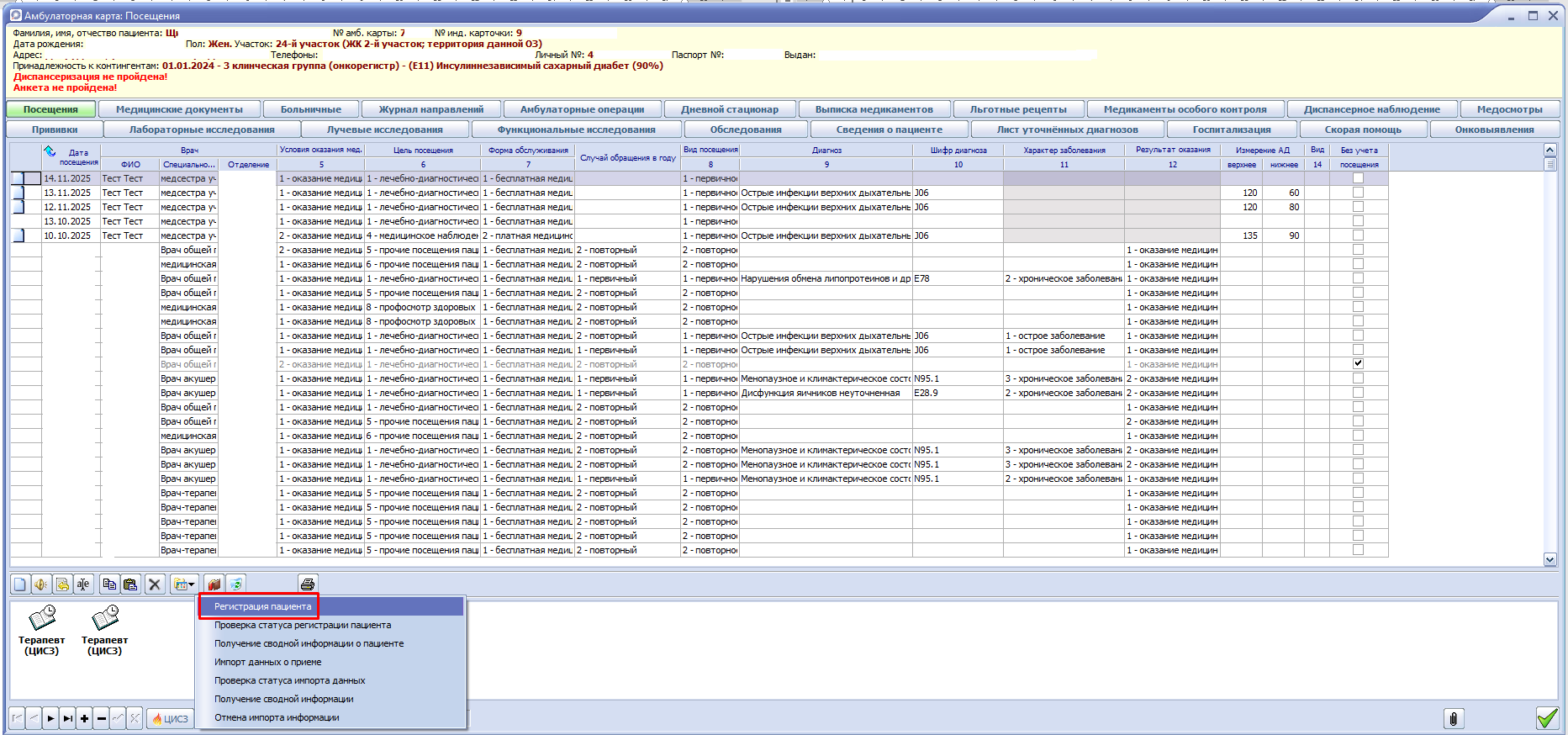 2.2. Выбрать посещение в списке посещений, и для выбранного посещения выбрать опцию ЦИСЗ – Импорт данных о приеме.