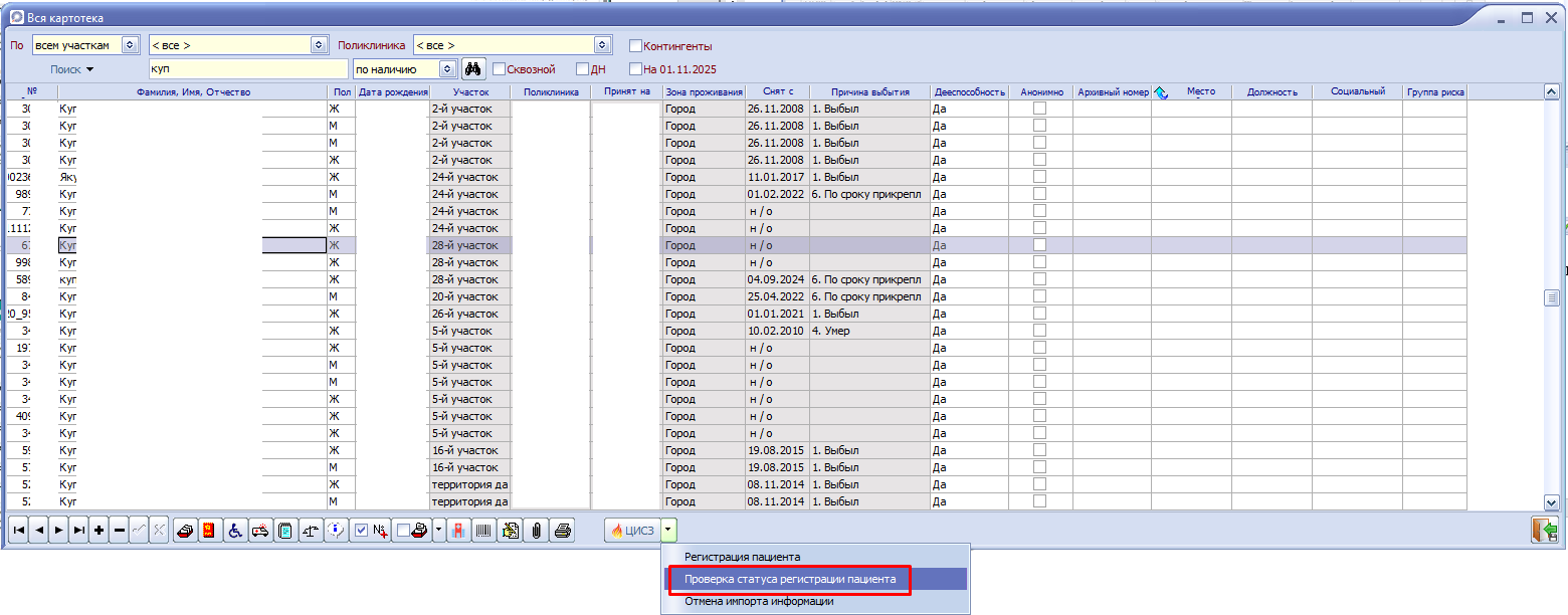 1.3.1. После регистрации пациента выбрать опцию ЦИСЗ – Проверка статуса регистрации пациента и убедиться в успешности регистрации пациента в ЦИСЗ.