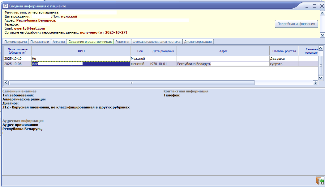 Медицинская информация о пациенте отображается на вкладках Приемы врача, Показатели (антропометрические, жизненно-важные, субъективного и объективного осмотра), Анкеты, Сведения о родственниках, Рецепты, Функциональная диагностика.