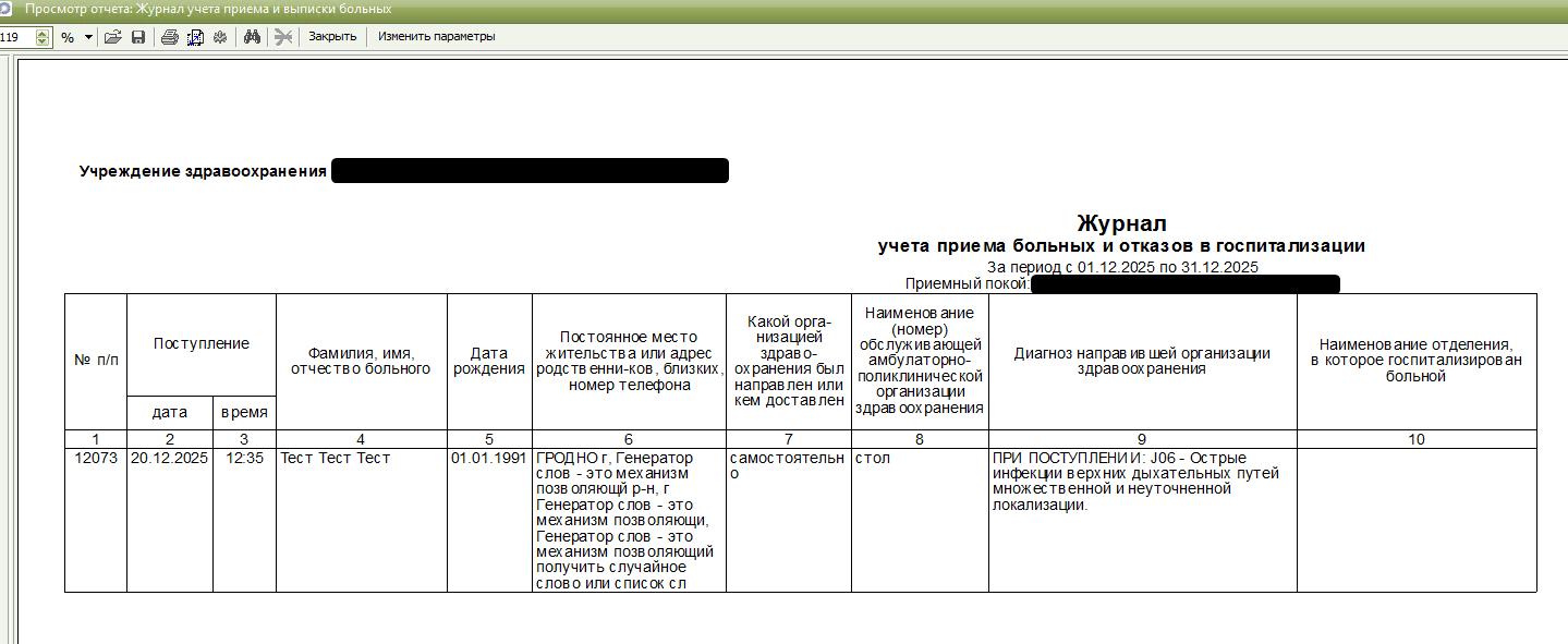 Доработан отчет "Журнал учета приема и выписки больных". Теперь у пациентов, перенаправленных в другие УЗ отображается место перенаправления в отчете "Журнал учета приема и выписки больных" в колонке 14.