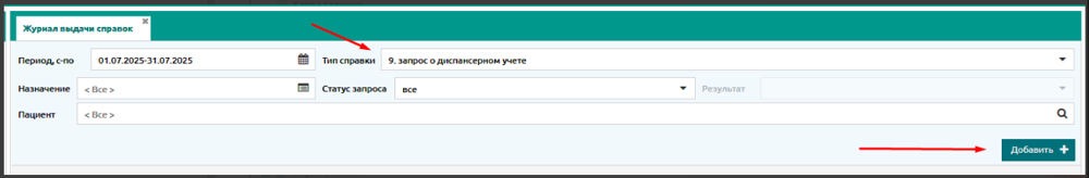 Для создания на форме "Журнал выдачи справок" с выбранным типом справки "9.запрос о диспансерном учете" нажимаем кнопку "Добавить"